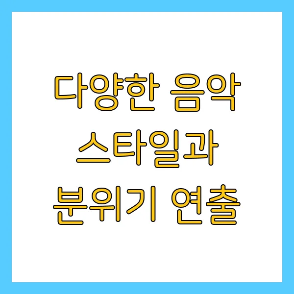- 장르별 프리셋: 팝, 락, 클래식, 재즈, 일렉트로닉, 힙합, R&B, 컨트리, 포크, 월드 뮤직 등 20개 이상의 장르별 프리셋을 제공합니다. 각 프리셋은 전문 작곡가들이 심혈을 기울여 제작했으며, 광고의 목적과 분위기에 맞춰 최적화되어 있습니다.